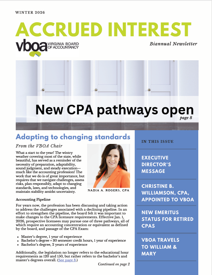 VBOA 每年发布两次新闻通讯,其中充满了与弗吉尼亚 CPA 和考生社区相关的新闻和更新以及纪律处分。